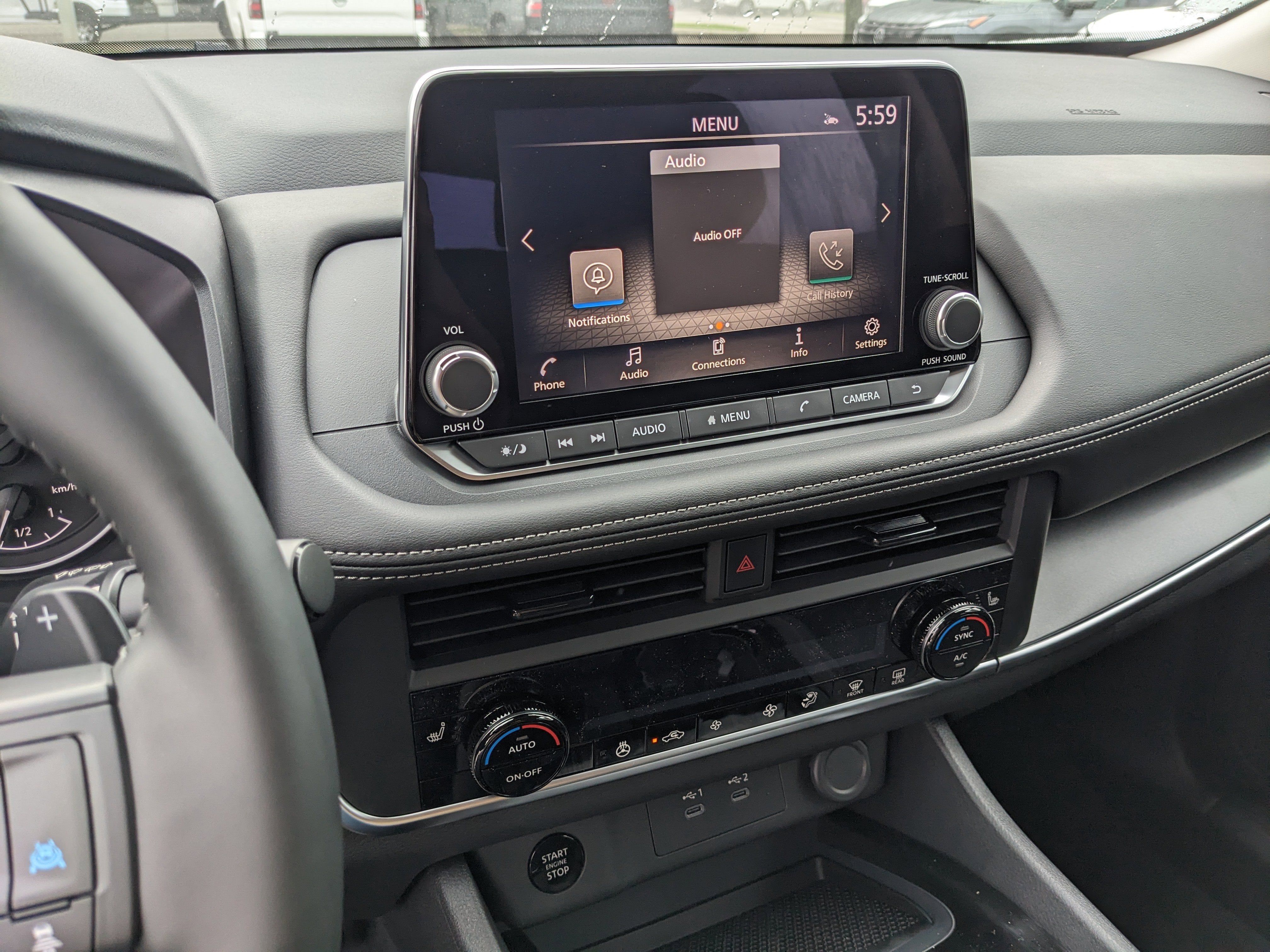 - Radio: AM/FM NissanConnect -inc: 6 speakers plus 2 tweeters, Apple CarPlay, Android Auto, 8" color touch screen display, Bluetooth®, 2 front USB type-C, Wi-Fi hotspot and NissanConnect Services powered by SiriusXM